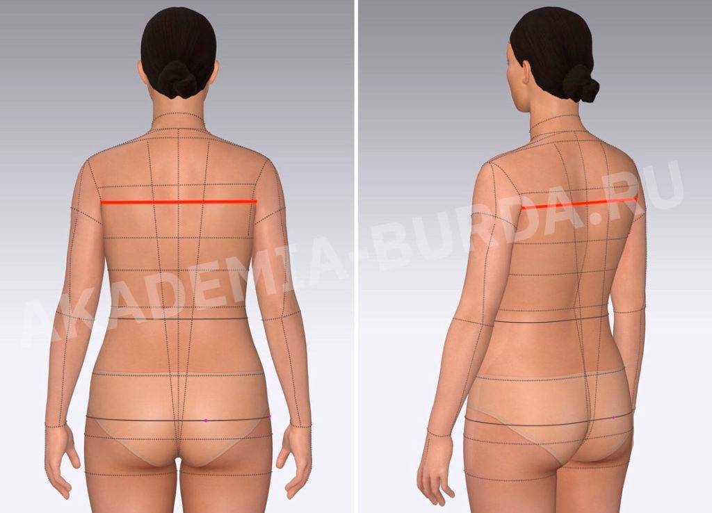 Это параметр должен проходить равной линией через всю спину по центру лопаток. На схеме можно посмотреть, как измерить ширину спины для выкройки правильно. Мерка «ширина спины» может быть разной, в зависимости от того на сколько ровно стоит человек.