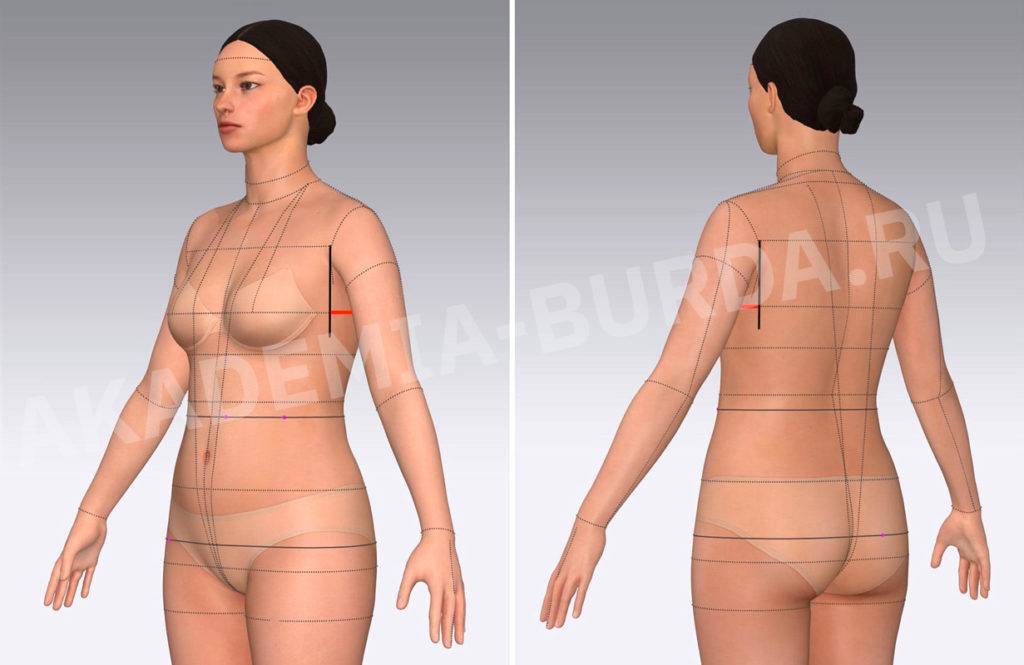 Впк (высота плеча косая) — измеряется от конечной плечевой точки до пересечения линии талии с позвоночником. При данном измерении лучше использовать плечевую накладку.