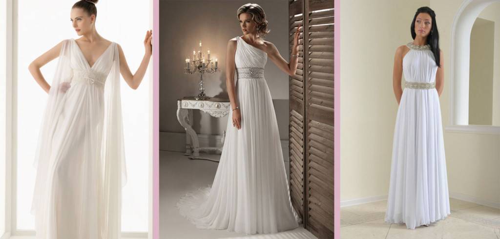 Все наряды с драпировками, мягким струящимся силуэтом именуются «греческими» из-за их сходства с туниками. Платье такого стиля не только скрывает практически все недостатки фигуры, прибавляя рост девушки, её стройность, но позволяет провести всё торжество, испытывая достаточный комфорт.