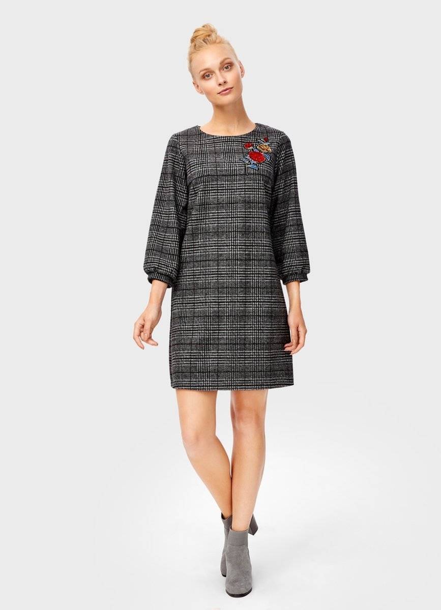 Хорошим вариантом для работы станут прямые платья. Актуальны серые модели с аккуратным круглым вырезом горловины и замшевыми черными карманами.