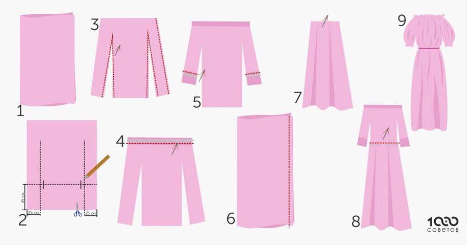 - Возьмите 2 прямоугольника лёгкой ткани: ширина — полу обхват бёдер или груди, длина — желаемая длина изделия от плеча до низа.