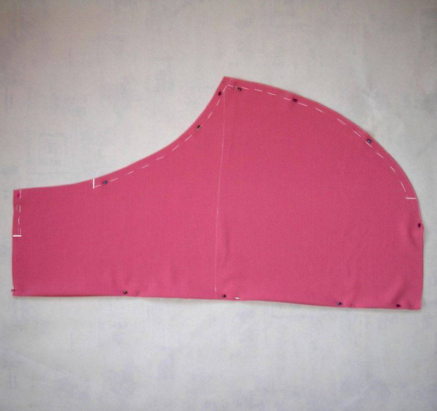 2. Проклеить верхний срез полочки нитепрошивной лентой. Сметать вытачки тонкой бисерной иголкой на передней детали, отрезной части переда и обтачке переда. Стачать на швейной машинке. Вытачки заутюжить наверх к пройме.