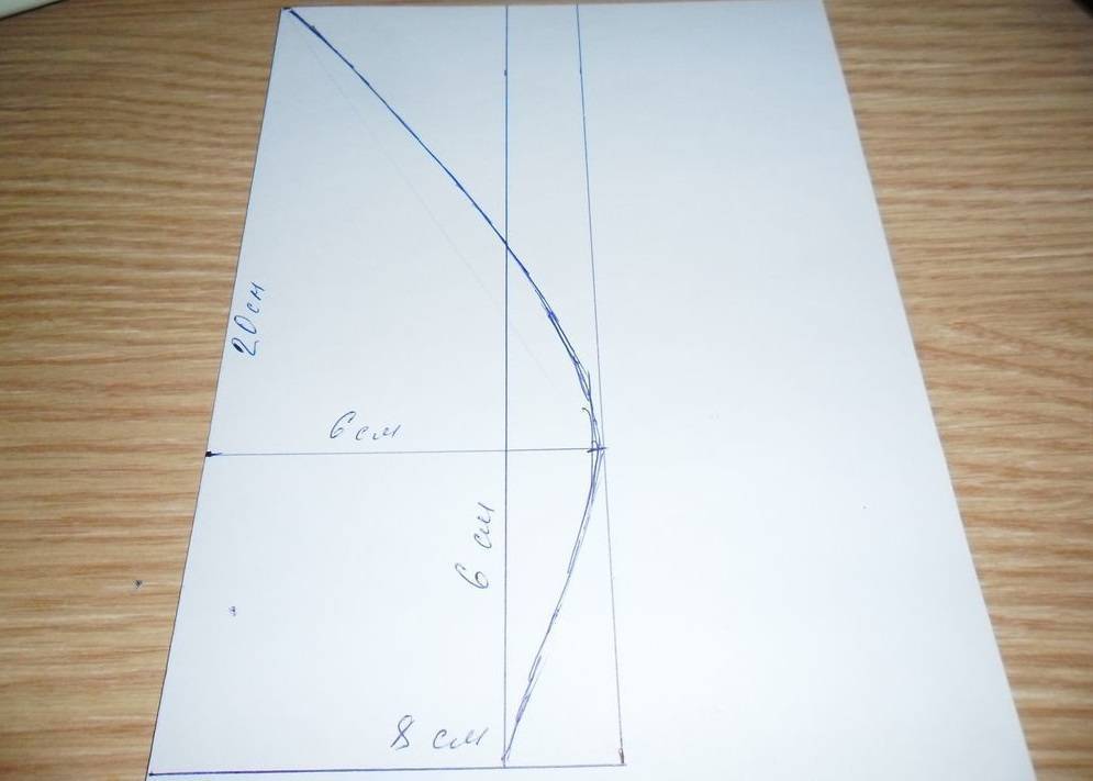 Теперь проводим через получившиеся точки контур клина, не забудьте проверить угол на вершине. Если вы желаете, чтобы верхушечка берета была плоской, то на виде сверху угол должен быть таким же. Для того чтобы соединять клинья, не забывайте оставлять припуски на шовчики.