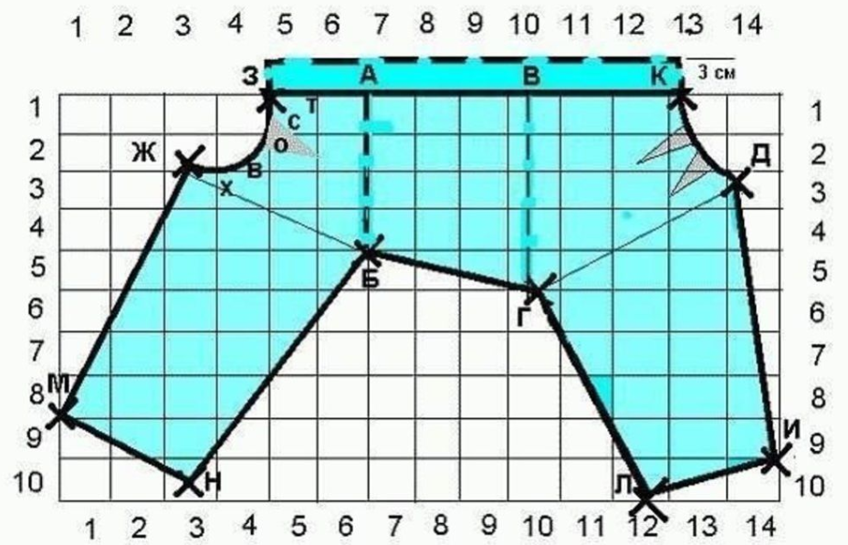Далее выкройка комбинезона, точнее, ее верхняя часть, строится так: