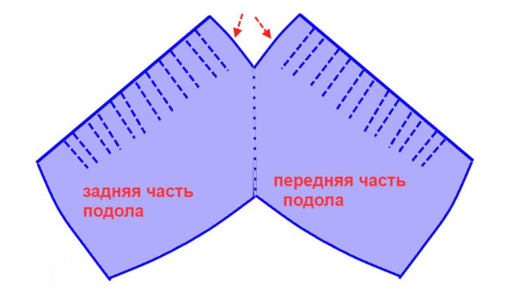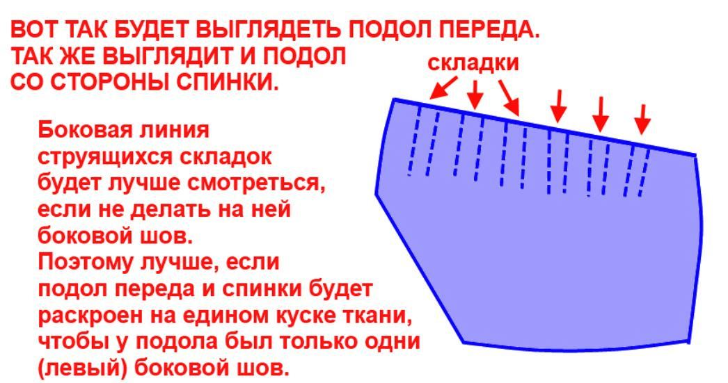 в области бокового шва. Принцип заключается в выкраивании деталей по длине больше, чем надо. Укорачивание делается по боковому шву. Для удобства используется эластичная тесьма. Во время нанесения строчки ее растягивают, а в стянутом состоянии получается горизонтальная сборка;