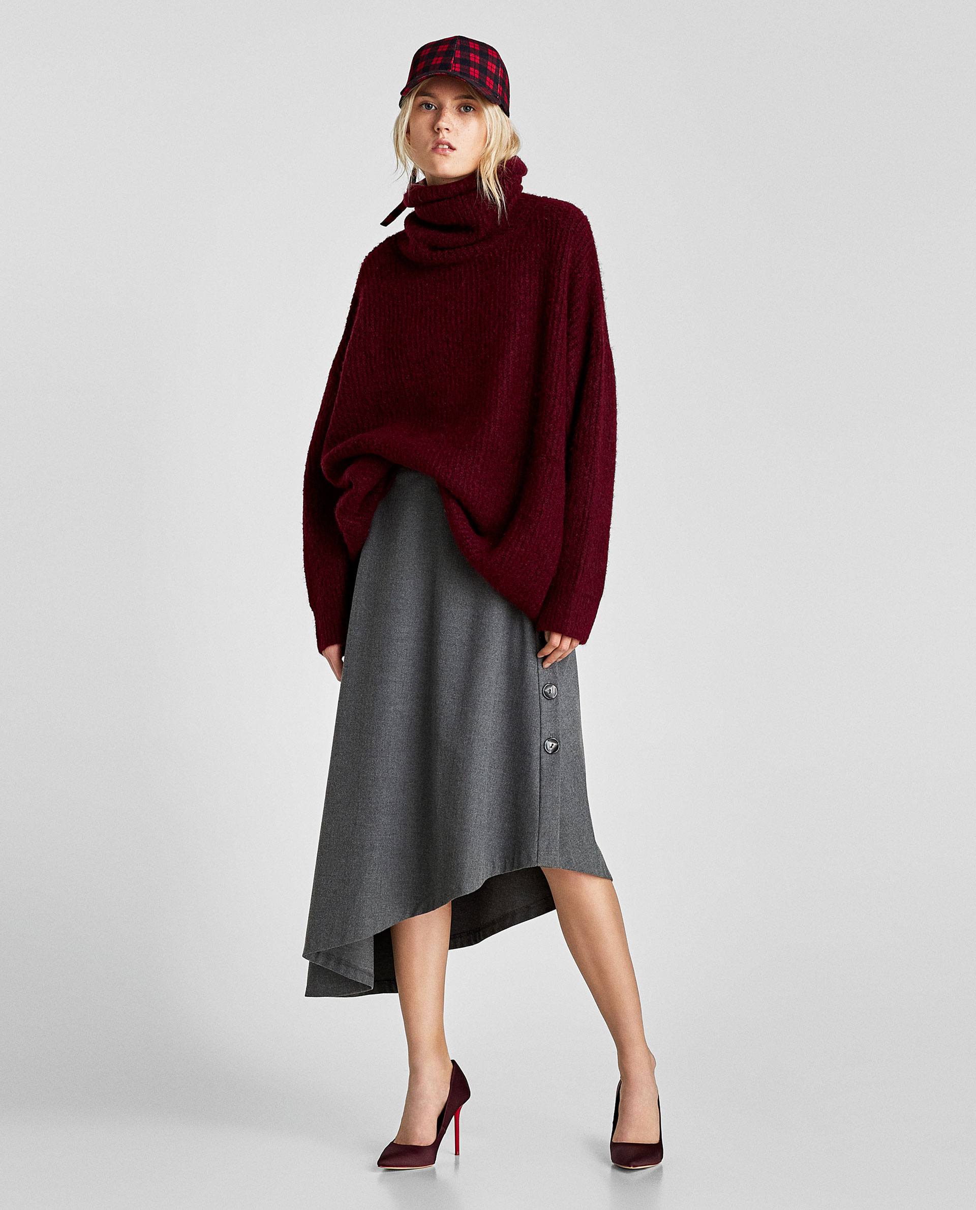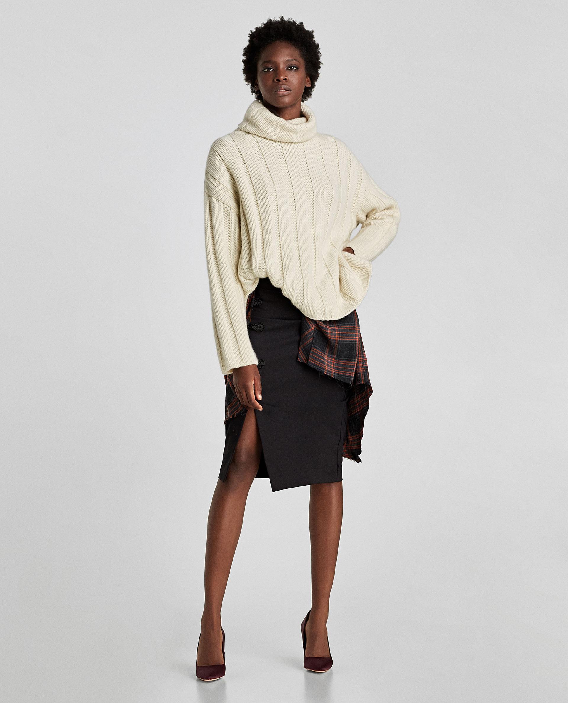 - Экземпляры из плотного материала должны быть расклешенными. Иначе они будут чересчур раскрываться при ходьбе. А их длина должна быть до колена или миди. Вязаная ажурная вещь сверху и элегантные сапоги сделают образ завершенным.