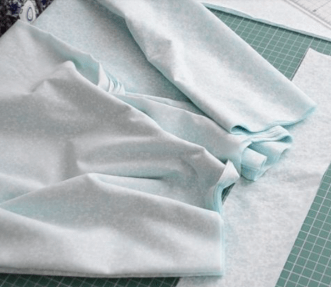 - Сшейте полоски обтачки друг с другом. Укрепите флизелином. Приметайте к горловине и рукаву с лицевой стороны, прошейте на машинке.