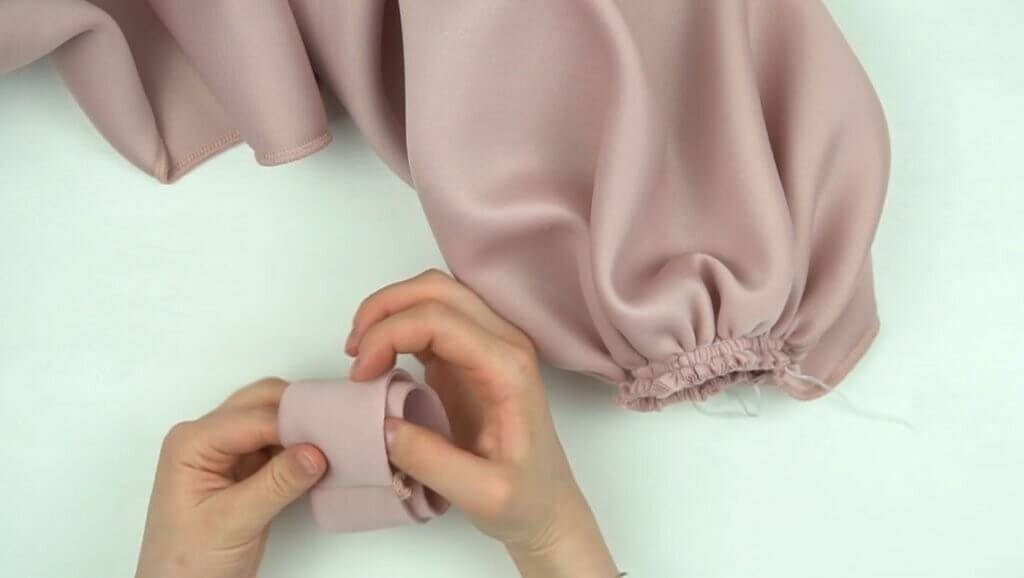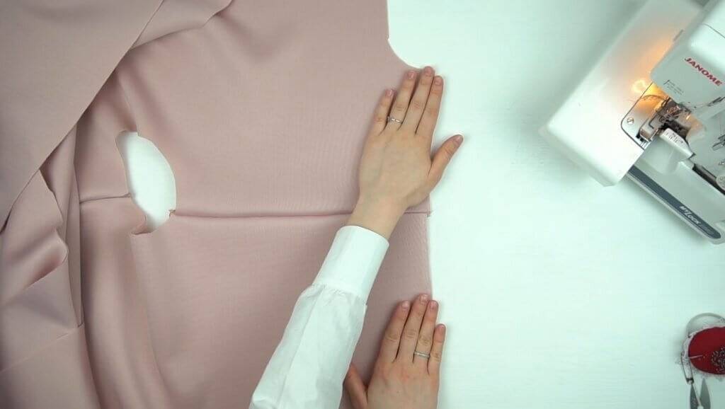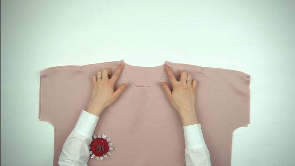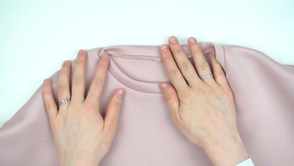 - Приступайте к обработке горловины и рукавов подкройной обтачкой.