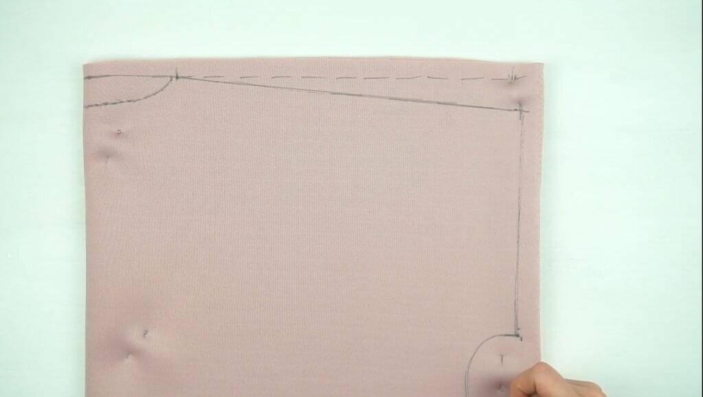 - Сложите ткань по плечевым швам, отложите мерки сразу на ткани, нарисуйте мелом прямые лини, скруглив в районе подмышек.