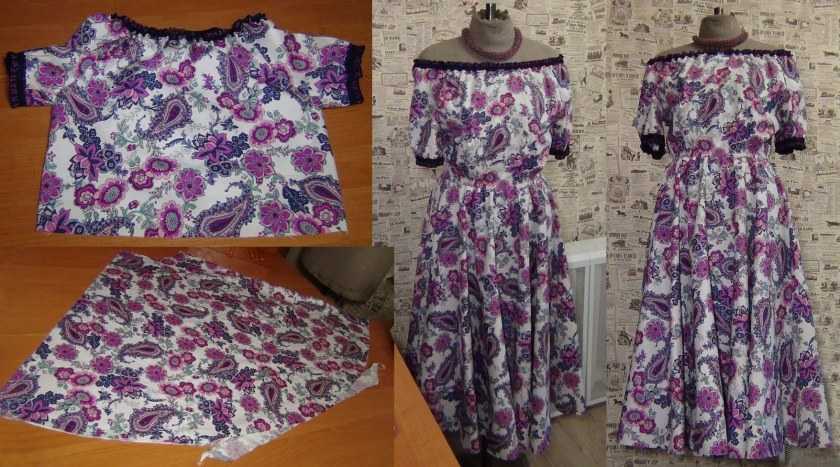 Далее, начинаем сшивать плечи. Плечи сшиваем так,чтобы остался запас ткани для шнура 2,5 см. Плечевые швы разутюживаем и прострачиваем, загнув ткань внутрь. У нас должно получиться на двух плечах 4 кулиски. Продеваем в них шнуры, чуть затягиваем и завязываем вместе. Плечо получается чуть сосборенное. Подшиваем низ, платье сшитое своими руками готово. Выбирайте ткань однотонную или с крупным цветочным рисунком, это очень актуально. Шьём выбранную классическую модель.